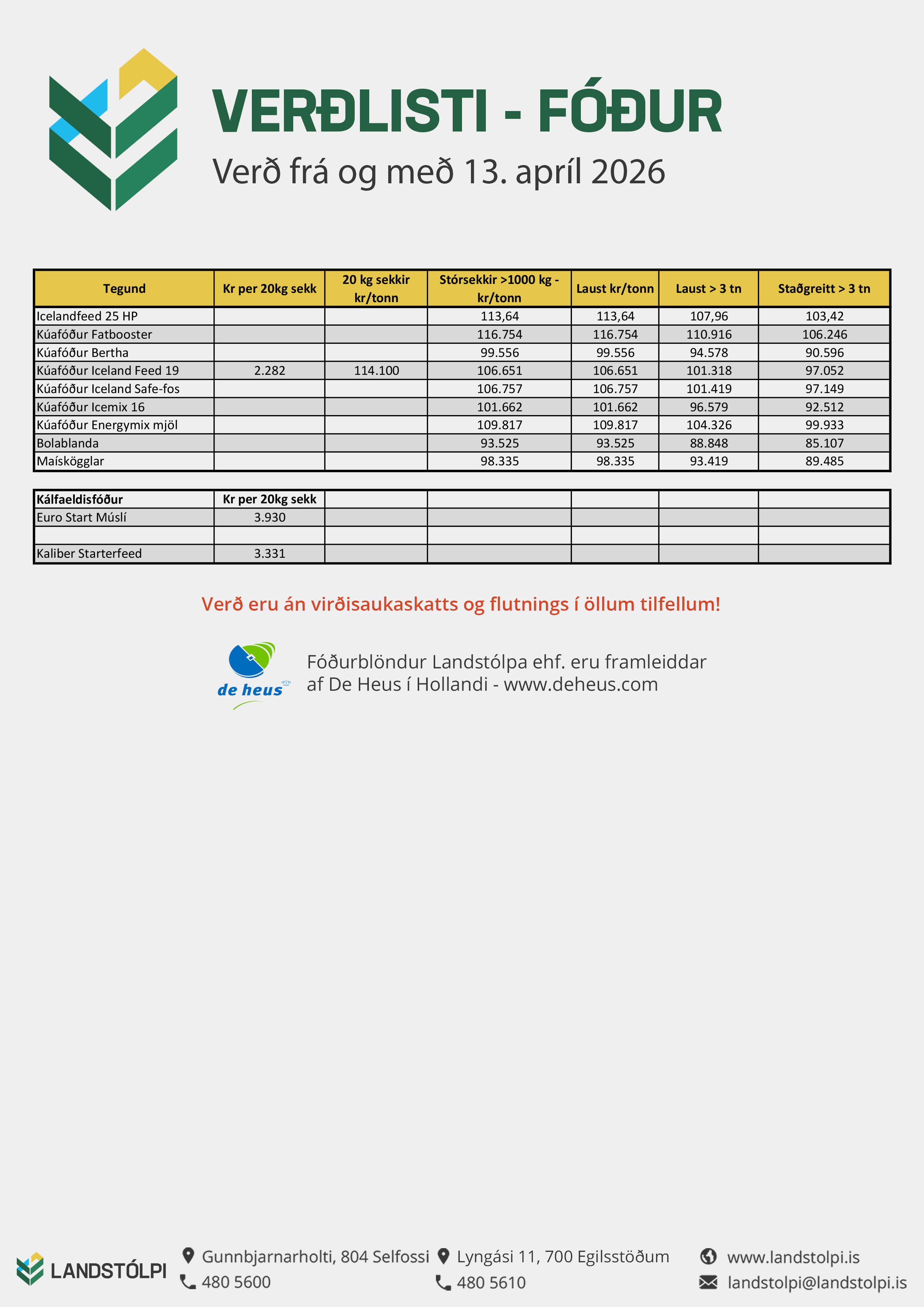 Frá og með mánudeginum 13. apríl hækkar Landstólpi verð á öllum fóðurblöndum um 3,5%.